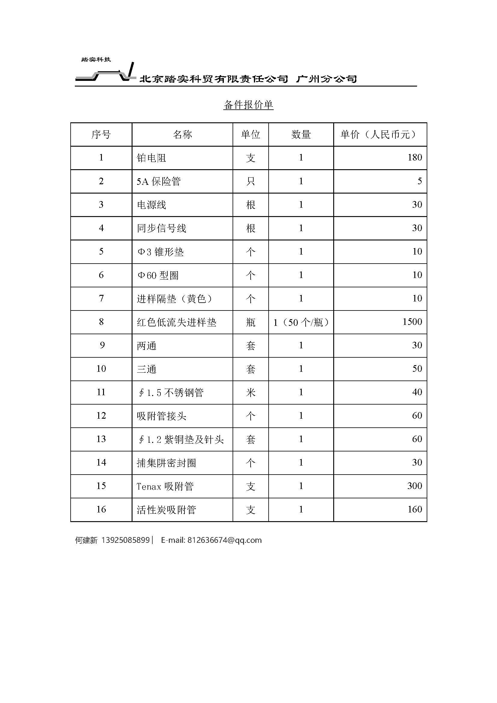 ? 北京踏實科貿(mào)有限責(zé)任公司 廣州分公司? 備件報價單?序號名稱單位數(shù)量單價(人民幣元)1鉑電阻支118025A保險管只153電源線根1304同步信號線根1305Ф3錐形墊個1106Ф6O型圈個1107進(jìn)樣隔墊(黃色)個1108紅色低流失進(jìn)樣墊瓶1(50個/瓶)1500???? ?? 9兩通套13010三